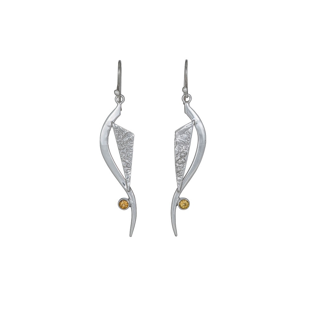 This stunning pair of earrings is the perfect combination of polished and textured sterling silver (92.5). With the elegant curved ‘S’ and the contrasting angular textured bar, the pop of colour from the gemstone at the bottom is the perfect design to create a stylish, eye-catching pair of earrings. In this pair, the stones are two fiery, golden multi-faceted Citrine gems.