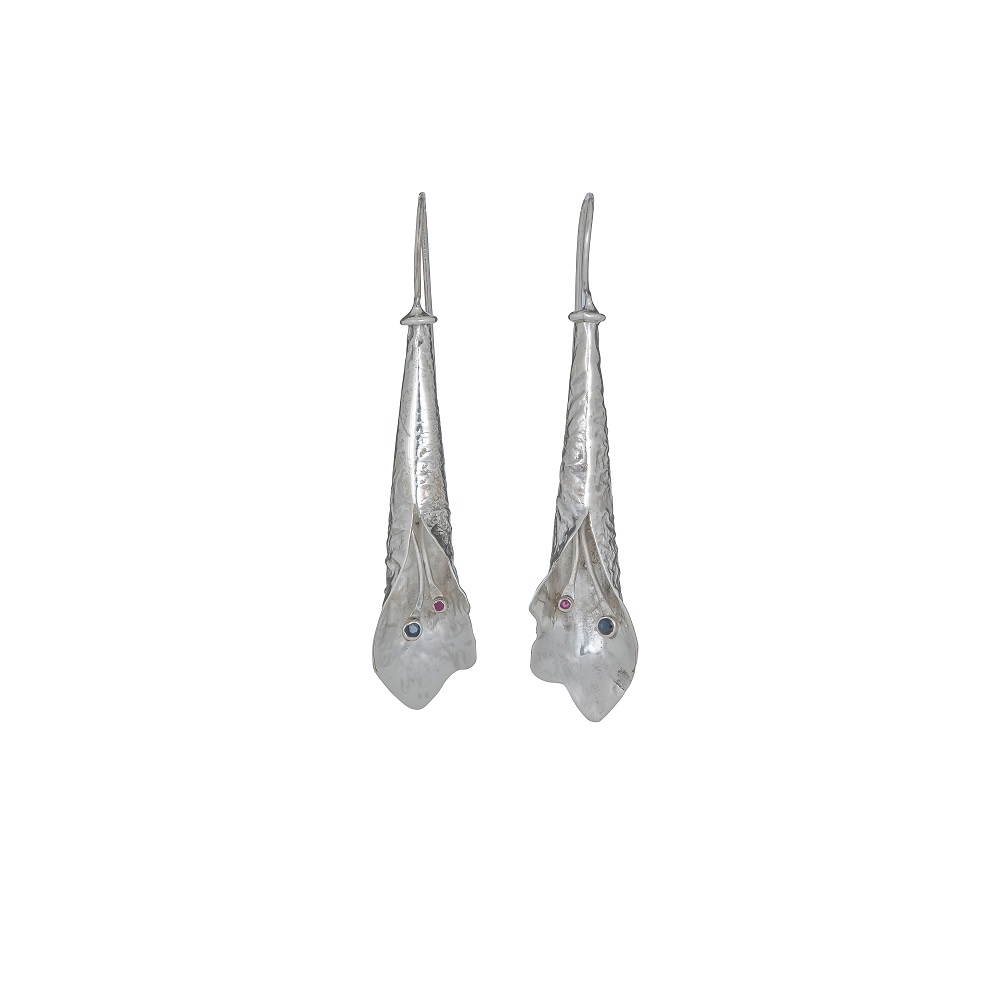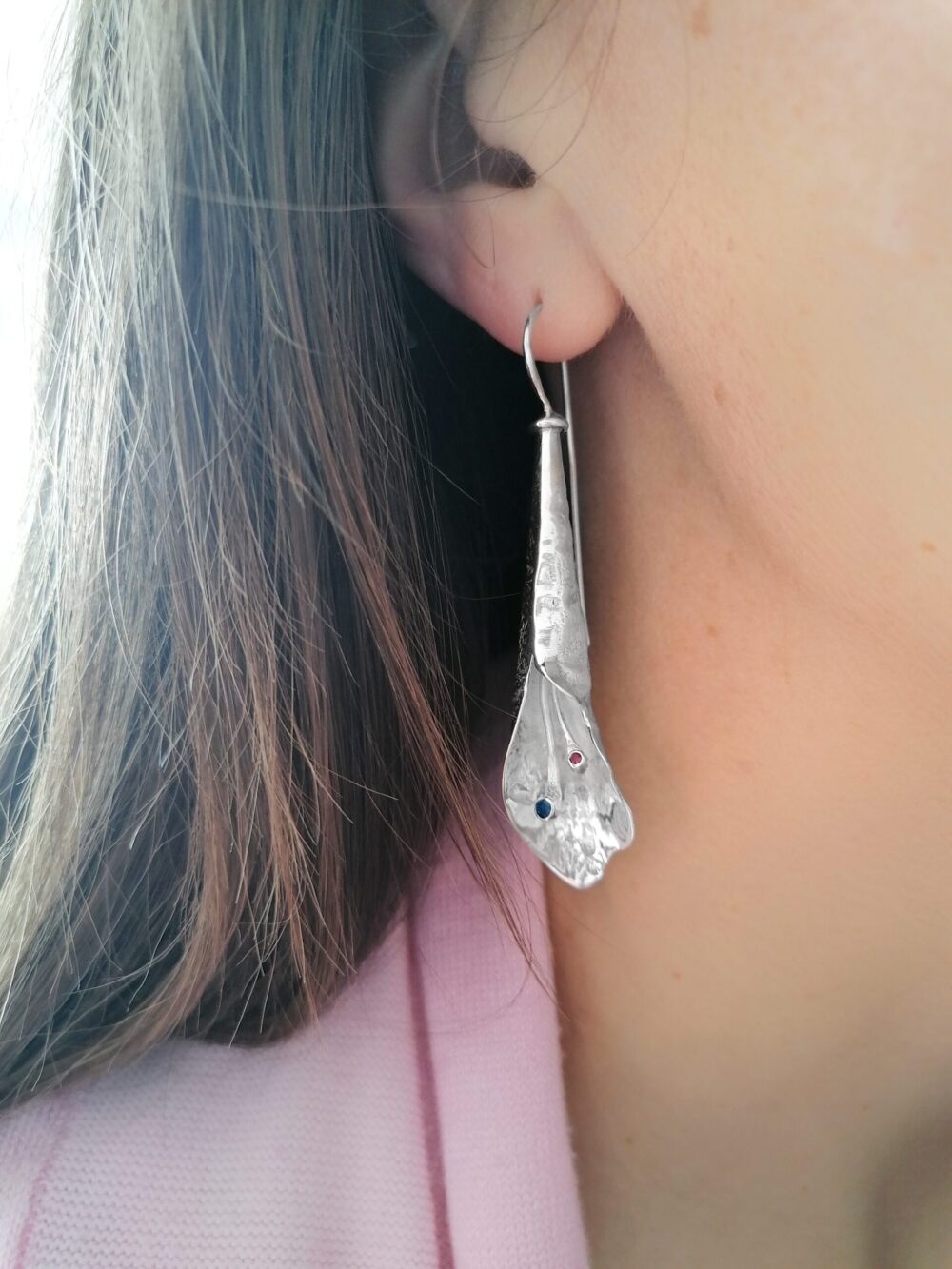 Handcrafted in 92.5 textured sterling silver, each one holds two slim ‘stems’ with tiny gemstones at the bottom, in this case a precious Ruby and Sapphire, beautifully mirroring nature’s creation. The long shepherd hook is joined onto the main body of the earring, creating a sturdy piece of jewellery that flows as one with your own movements. Long but lightweight, these earrings are easy on the ear, weighing no more than 4.5 grams each.