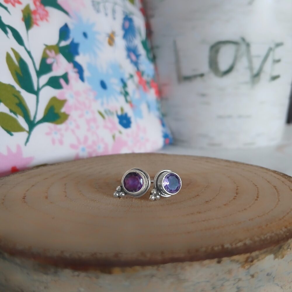 This gorgeous pair holds two beautiful Amethyst gemstones, multi-faceted and bezel-set.