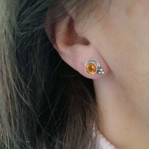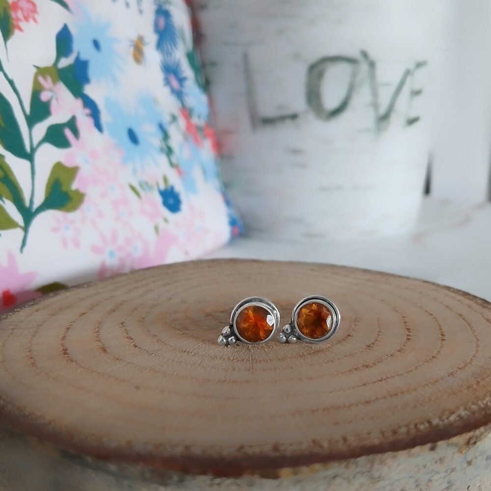 This gorgeous pair holds two fiery Orange Citrine gemstones, multi-faceted and bezel-set.