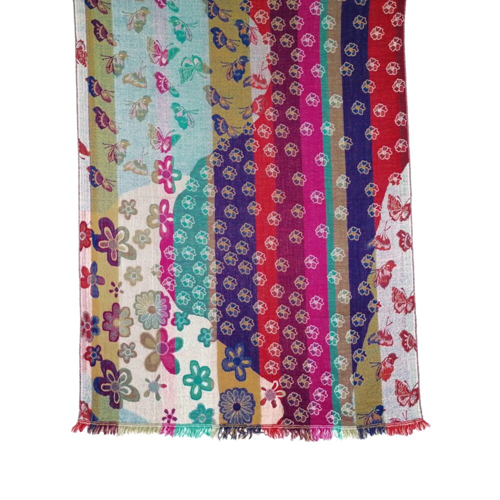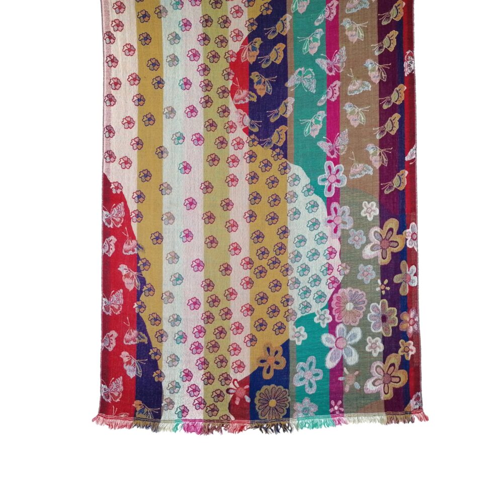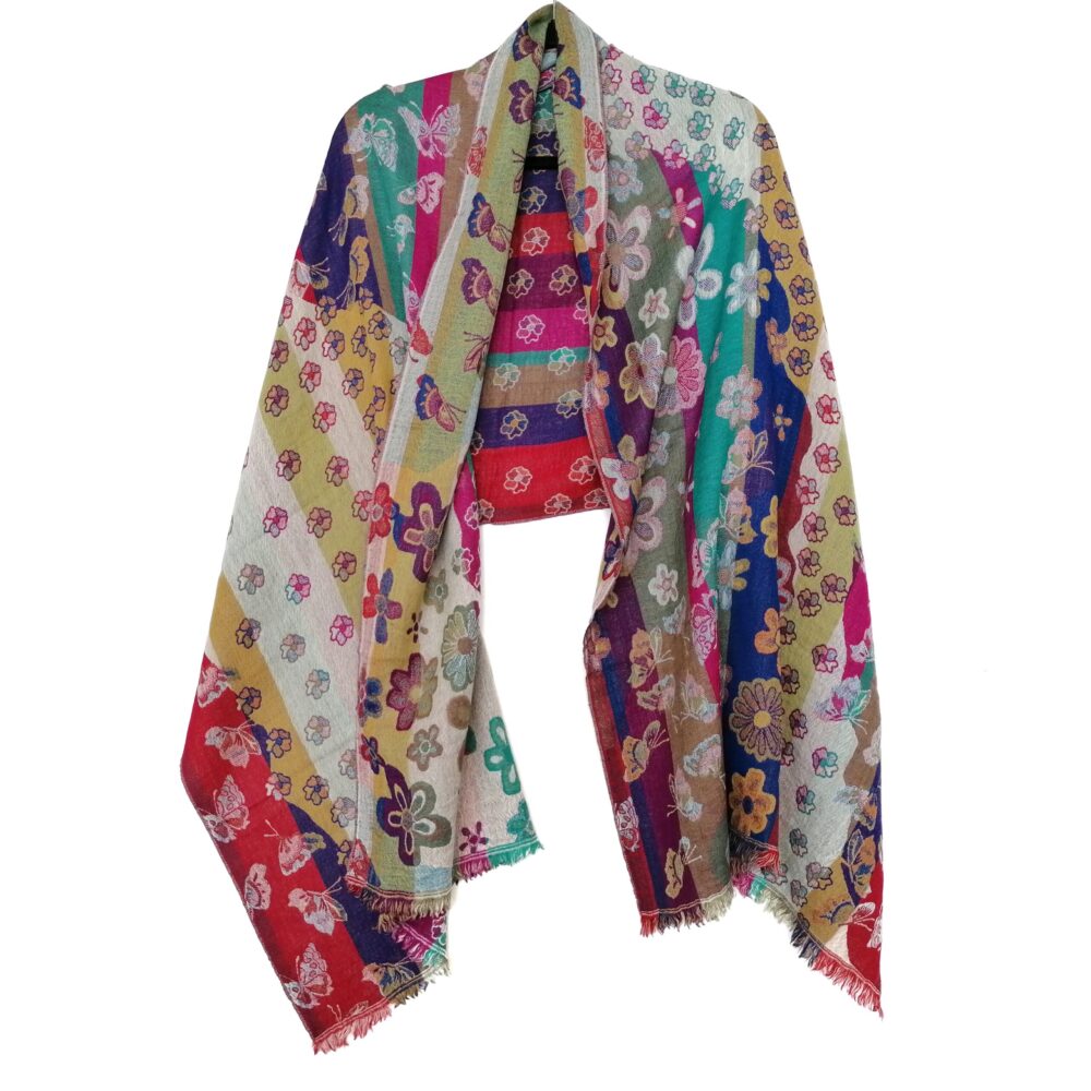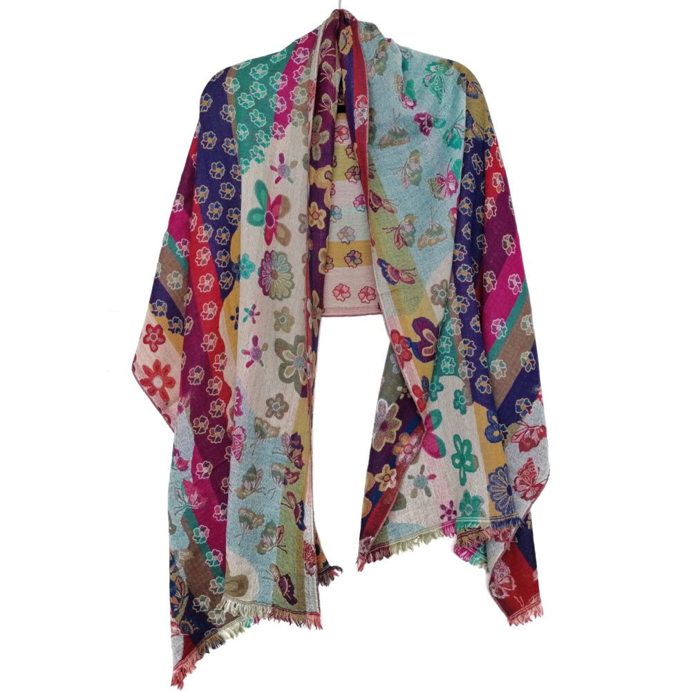 With our popular butterfly and flower motif, plus the most vibrant shades of scarlet, raspberry pink, emerald green, warm orange and hints of purple, this merino shawl is a real beauty. Like the majority of our shawls, it’s completely reversible, and has a neat fringe at either end. A real stand-out piece, it will bring joy and colour to any outfit.