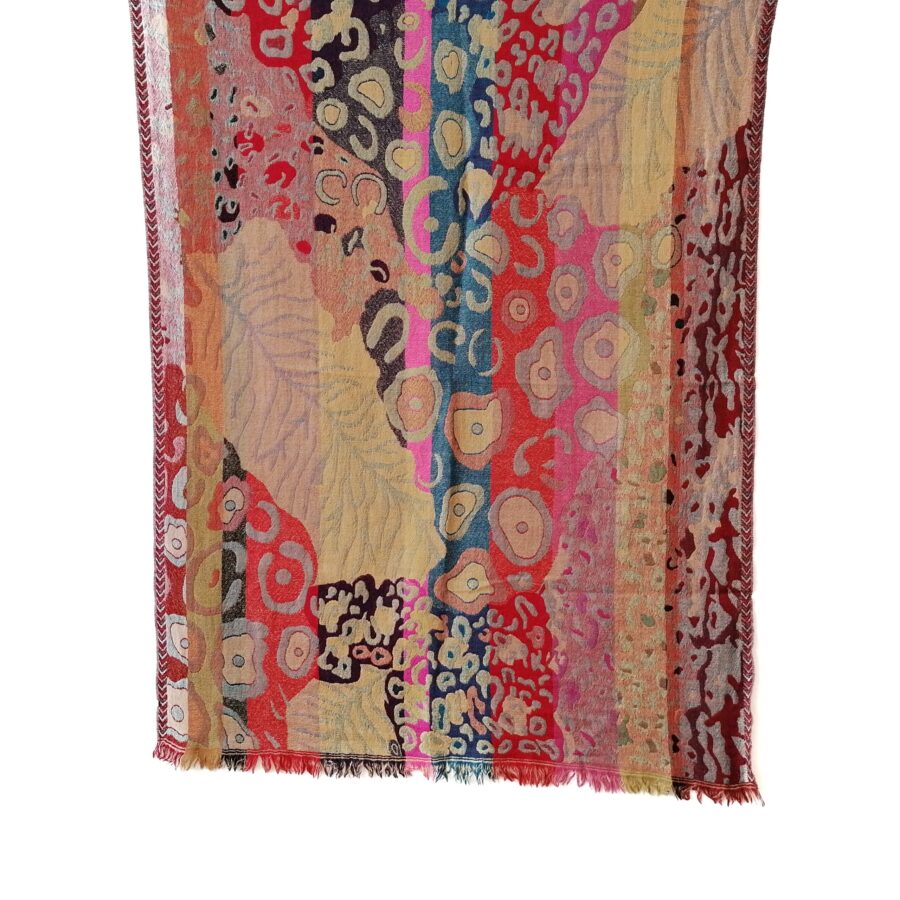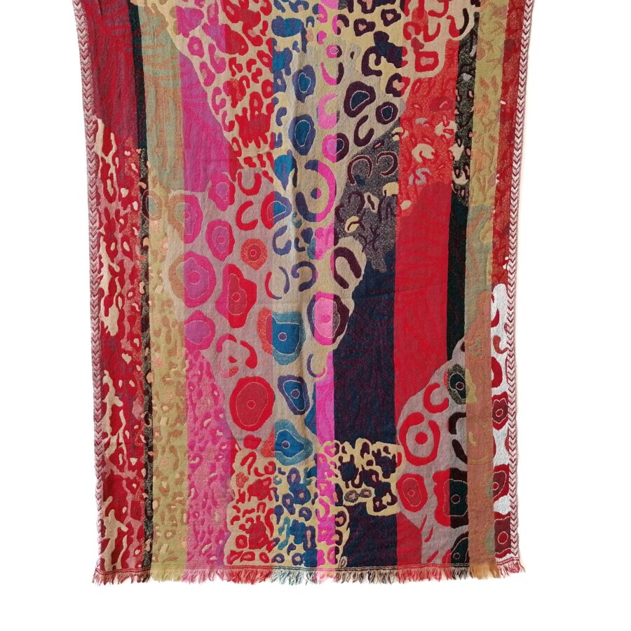 Soft merino wool shawl with a stunning pattern inspired by the artist Klimt, in shades of purple, deep red and soft yellow; reversible and bordered either end with a neat fringe.