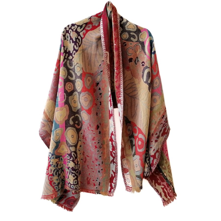 This shawl is an elegant, sophisticated sister to our original Vibrant Klimt shawl. It has the same incredible motif throughout, inspired by the artwork of Austrian artist Klimt, but in a more muted and discrete colour palette, with shades of deep purple, honey yellow, ruby and magenta, to name just a few – it too is a spectacular work of art! With two strongly contrasting sides, this reversible shawl is bordered either end with a neat fringe. If you want to stand out, this is the piece for you!