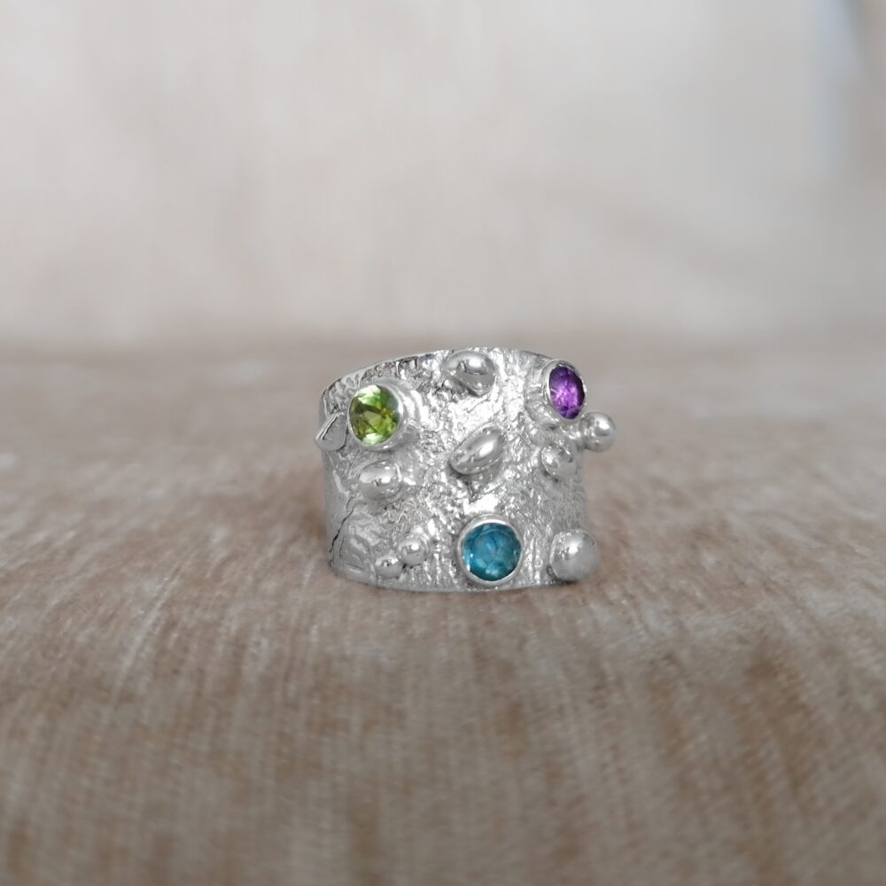 Our “Harmony, Wisdom and Understanding” ring collection consists of beautiful wide-band rings with three gorgeous gemstones to symbolise each of the three special qualities. The ring is a special reminder of them, each time you wear it. Ethically handcrafted in textured sterling silver (92.5) each ring holds a Blue Topaz at the bottom and two gemstones above – on this ring, a verdant Peridot and a royal purple Amethyst.