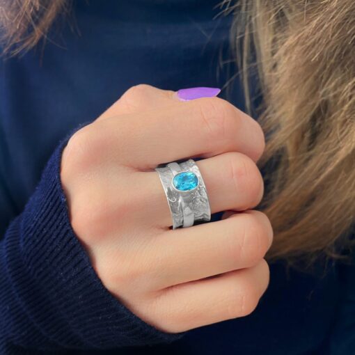 Each of these Serenity rings has been ethically handcrafted in sterling silver (92.5), the wide concave band with the uniquely textured effect and the spinning band in polished silver which holds one vibrant gemstone in a bezel setting. This ring has a beautiful, sparkling Blue Topaz gemstone, a stone associated with communication and self-expression and the ability to think clearly…