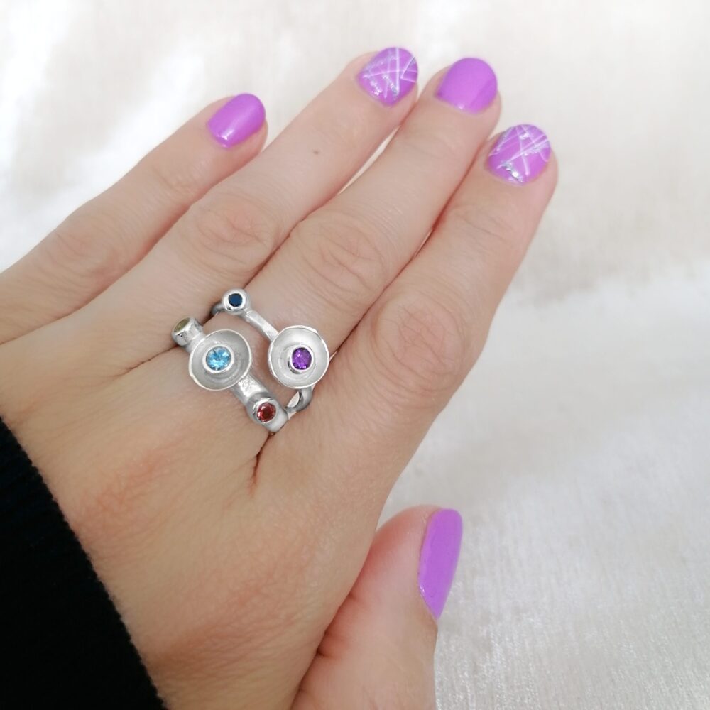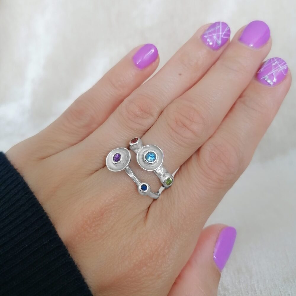 Each gemstone is bezel-set; the Amethyst and Blue Topaz are surrounded by ‘petals’ and either side of them are Peridot, Iolite and Garnet. A delicate, elegant mix of colour and beauty.