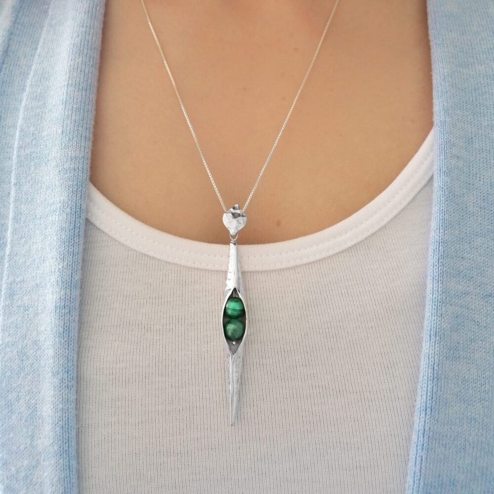 A beautiful Caraliza Seedpod pendant, handcrafted in hammered sterling silver (92.5), with two rich green Malachite beads nestled within, and an elegant leaf-shaped bail.