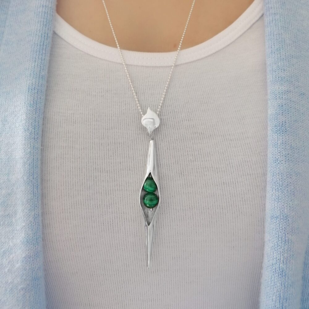 A beautiful Caraliza Seedpod pendant, handcrafted in polished sterling silver and with two eye-catching Malachite beads nestled within. In keeping with our love of nature, we specifically designed the silver bail to reflect the soft shape of a leaf.