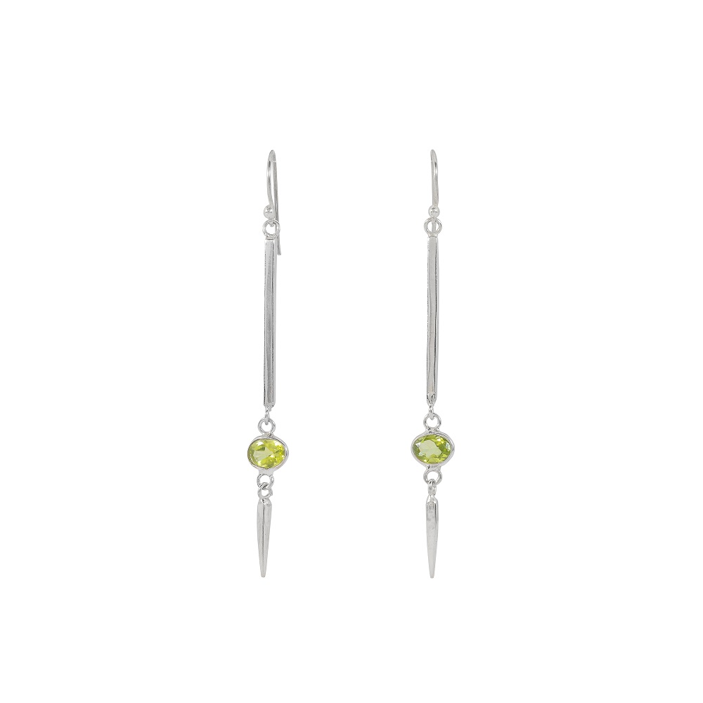 These beauties, handcrafted in 92.5 sterling silver, hold two rich green, multi-faceted, Peridot gemstones. Each part of the earrings moves independent of the rest, creating a fluid, eye-catching design; the long silver bar, the vibrant gemstone and the pointed silver ‘spear’ at the bottom