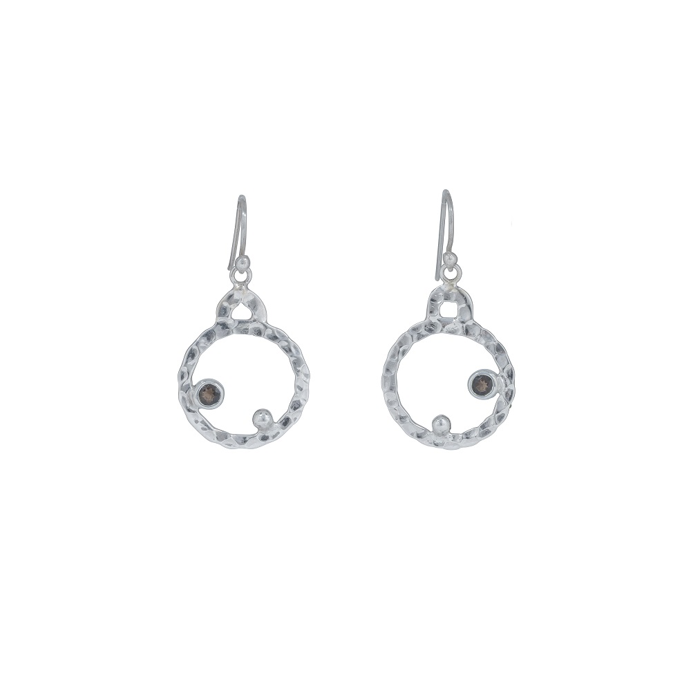 Each pair of elegant Cosmos earrings is handcrafted in hammered sterling silver (92.5) with sparkling gemstones and silver accents. These particular earrings have two deep Smoky Topaz gems (in bezel settings). Lightweight and neat, they are the perfect earrings for everyday wear, adding a splash of style to any outfit.