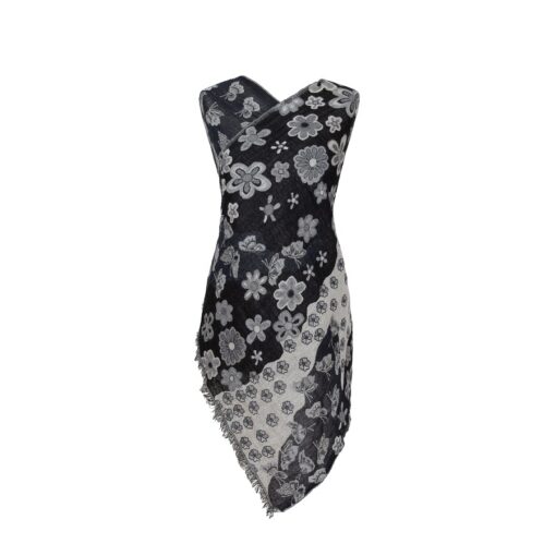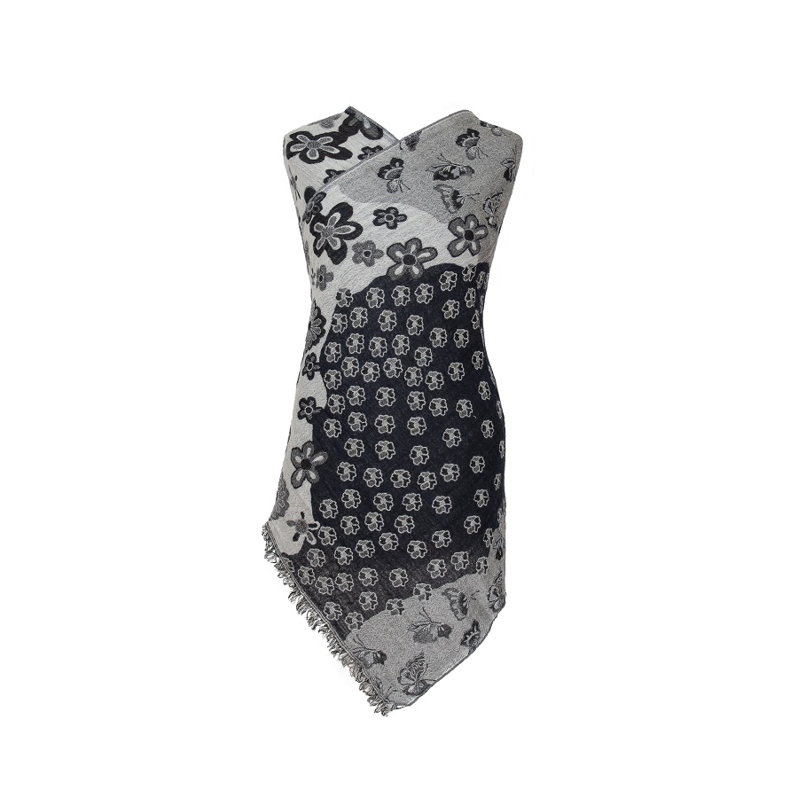 This soft merino shawl has a fabulous pattern of butterflies and dainty flowers and petals throughout, in classy monochrome. It’s fully reversible, with a neat fringe either end.