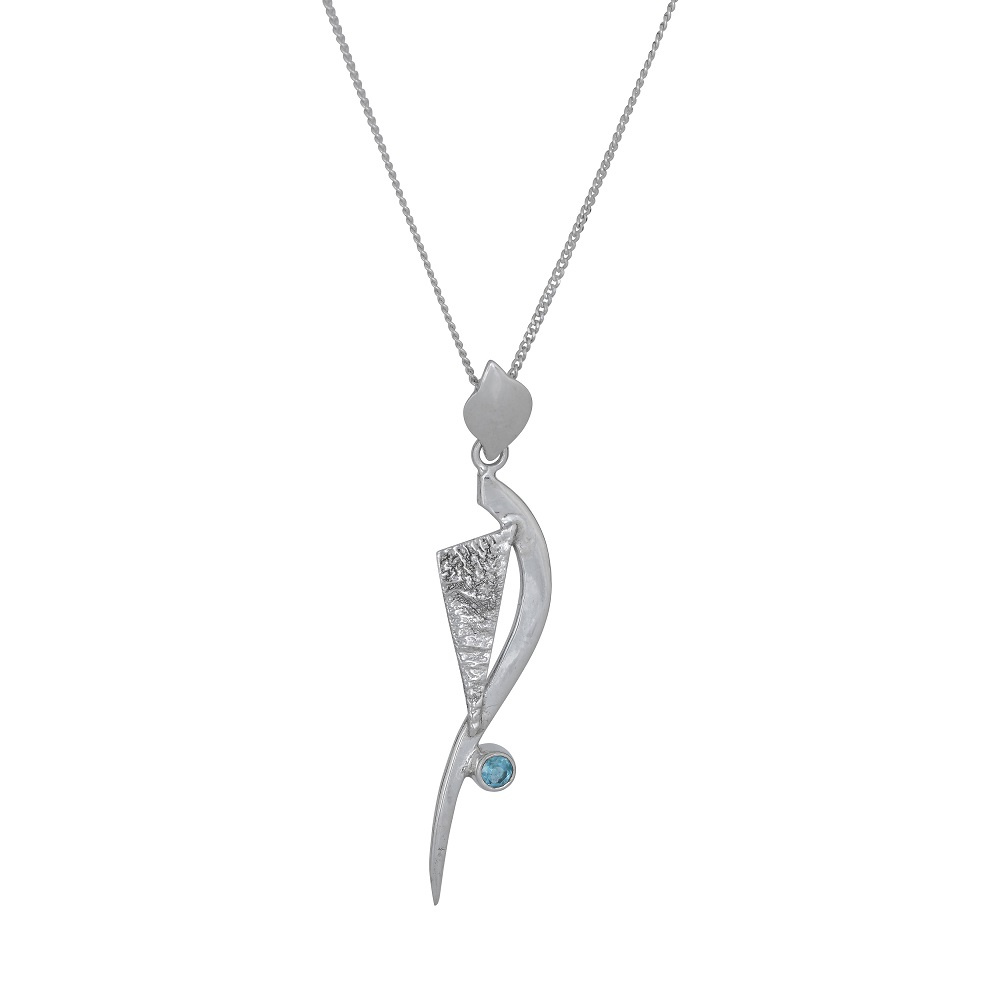 This stunning pendant is the perfect combination of polished and textured sterling silver (92.5). With the elegant curved ‘S’ and the contrasting angular textured bar, the pop of colour from the gemstone at the bottom is the perfect design to create a stylish, eye-catching piece of jewellery. In this piece, the stone is a gorgeous, sparkling Blue Topaz!