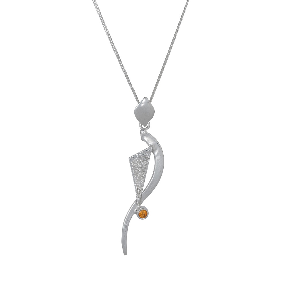 This stunning pendant is the perfect combination of polished and textured sterling silver (92.5). With the elegant curved ‘S’ and the contrasting angular textured bar, the pop of colour from the gemstone at the bottom is the perfect design to create a stylish, eye-catching piece of jewellery. In this piece, the stone is a vibrant, fiery Orange Citrine!