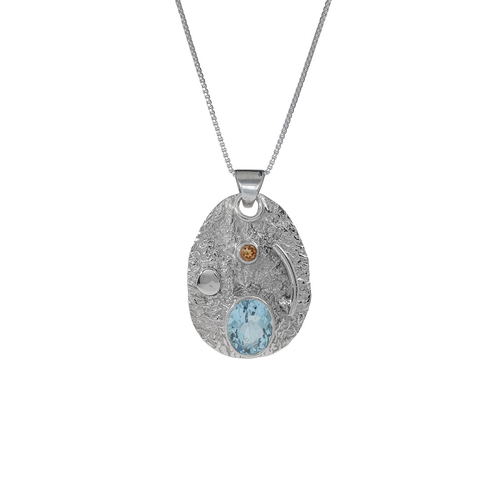 Inspired by love! A stunning, textured, sterling silver pendant and chain, with sparkling Blue Topaz and Citrine gemstones and silver accents.