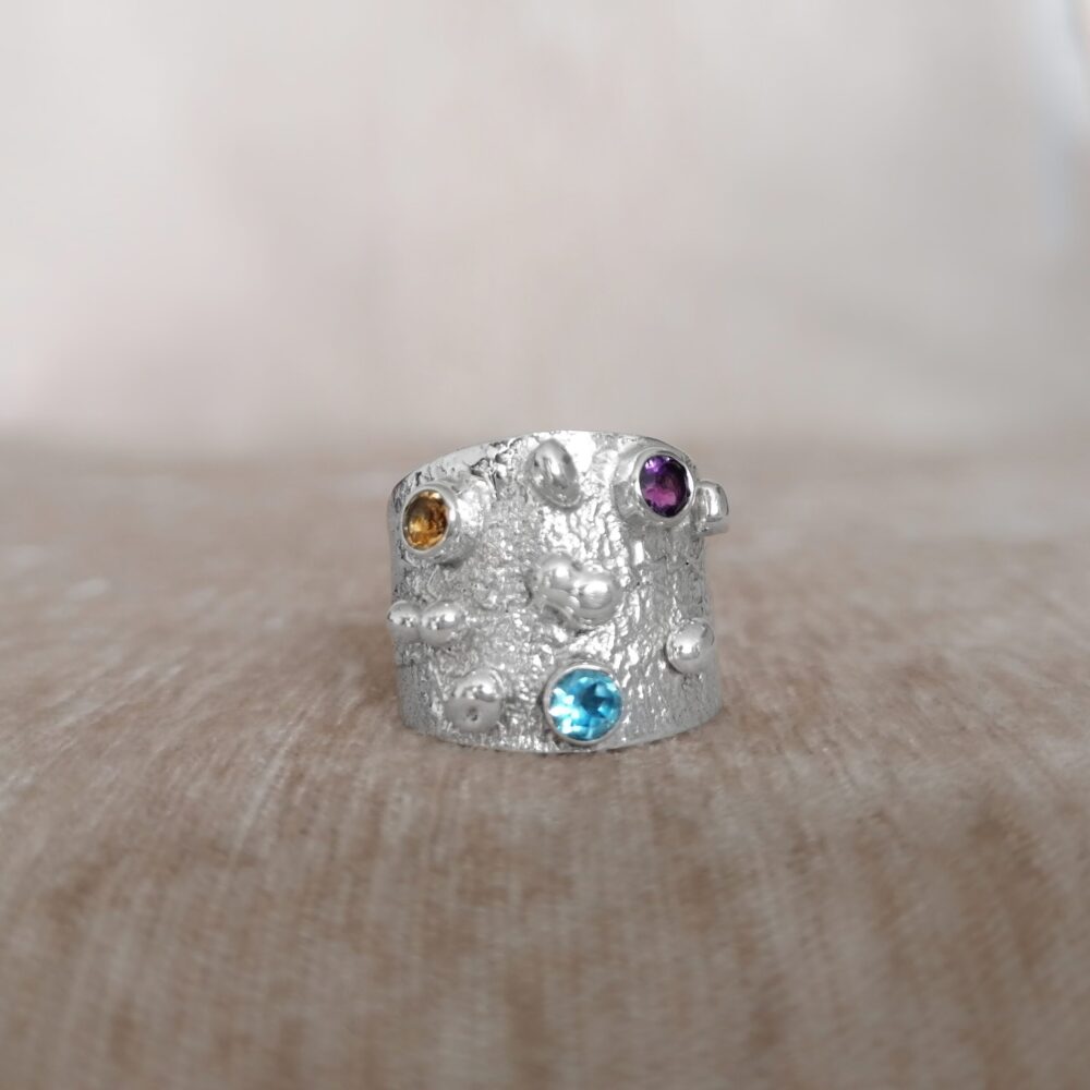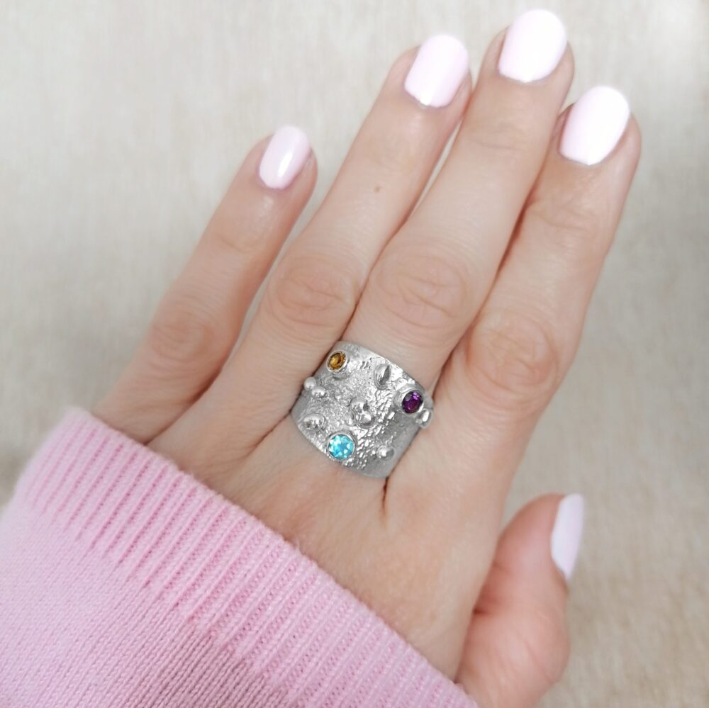 Our “Harmony, Wisdom and Understanding” ring collection consists of beautiful wide-band rings with three gorgeous gemstones to symbolise each of the three special qualities. The ring is a special reminder of them each time you wear it. Ethically handcrafted in textured sterling silver (92.5) each ring holds a Blue Topaz at the bottom and two gemstones above – on this ring, a golden Citrine and a deep purple Amethyst.