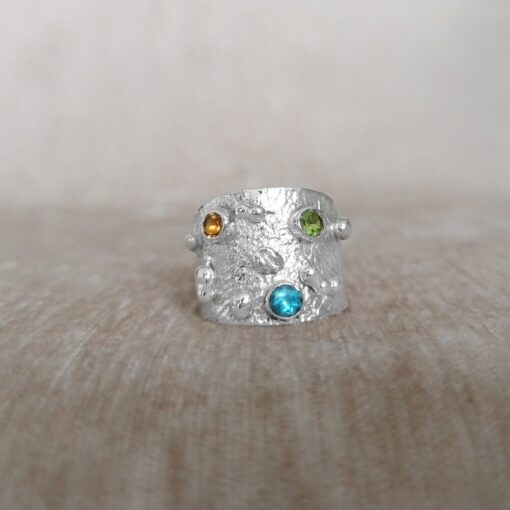 Our “Harmony, Wisdom and Understanding” ring collection consists of beautiful wide-band rings with three gorgeous gemstones to symbolise each of the three special qualities. The ring is a special reminder of them each time you wear it. Ethically handcrafted in textured sterling silver (92.5) each ring holds a Blue Topaz at the bottom and two gemstones above – on this ring, a golden Citrine and a vibrant green Peridot.
