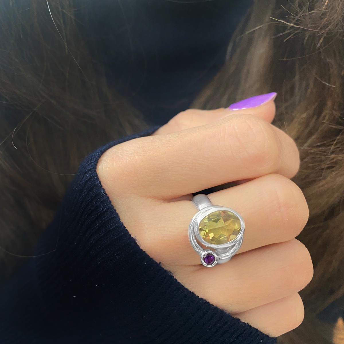 This ring, handcrafted in 92.5 sterling silver, features a multi-faceted, sunny Lemon Topaz gemstone, and a tiny multi-faceted Amethyst is set into the silver loop that swivels freely around the Lemon Topaz, a unique feature that’s both beautiful and perfect for fiddling with!